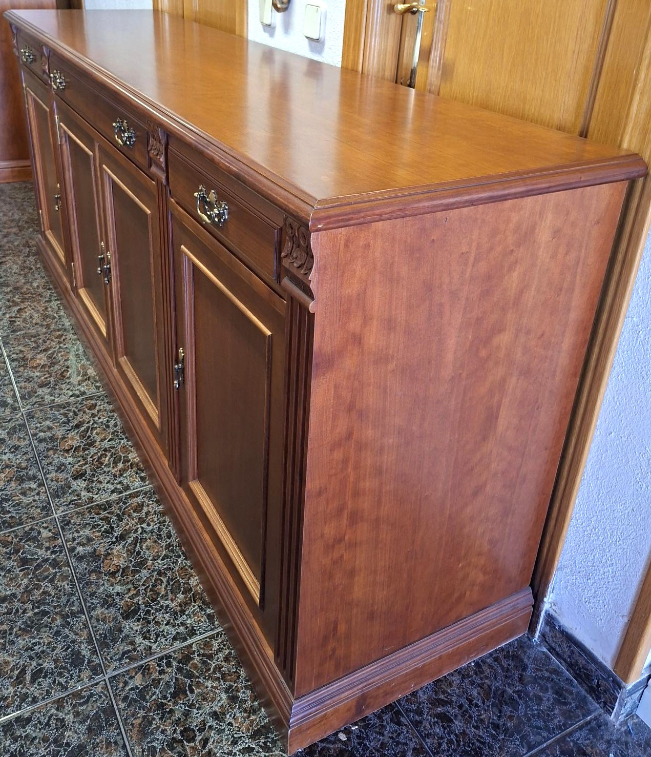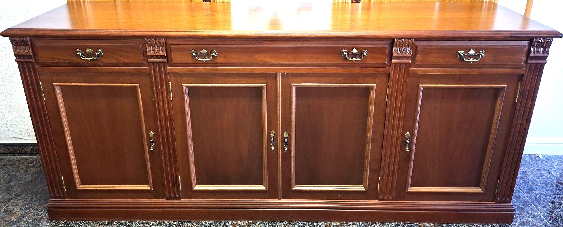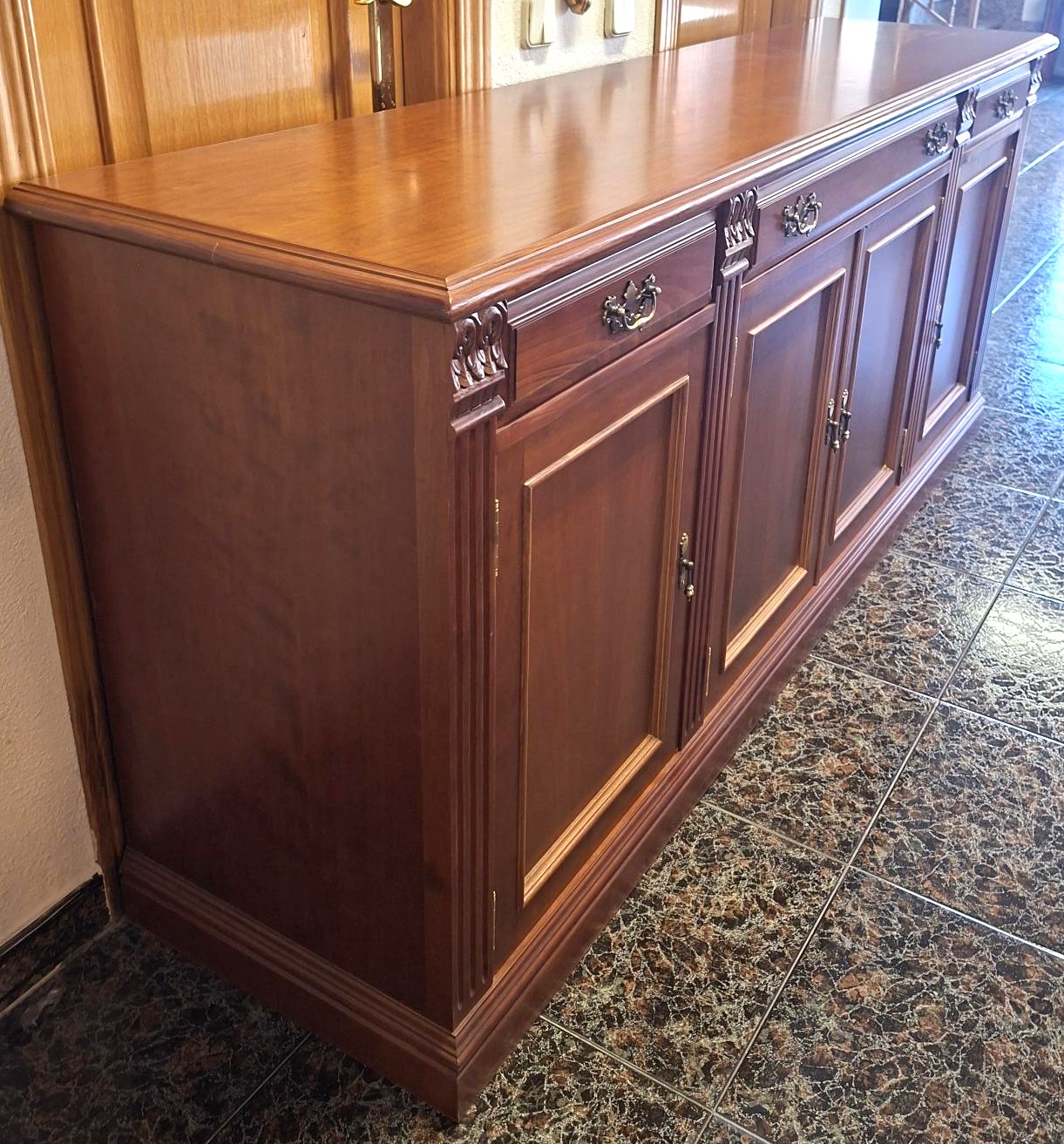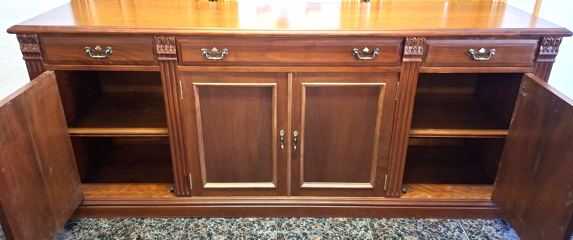 APARADOR CEEZO CON PILASTRAS Y TALLAS 4 PUERTAS FONDEADAS Y 3 CAJONES MOLDADOS , BALDAS INTERIORES ,MEDIDAS 204 X 50 X 88