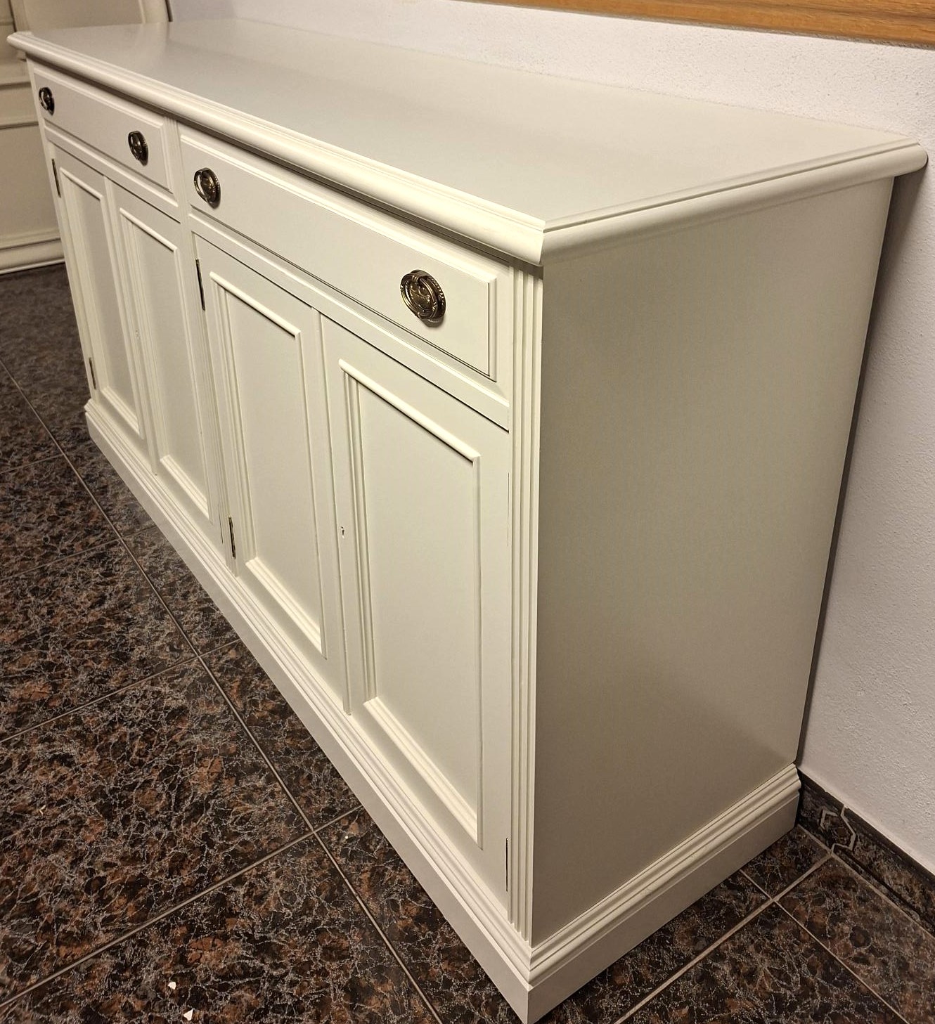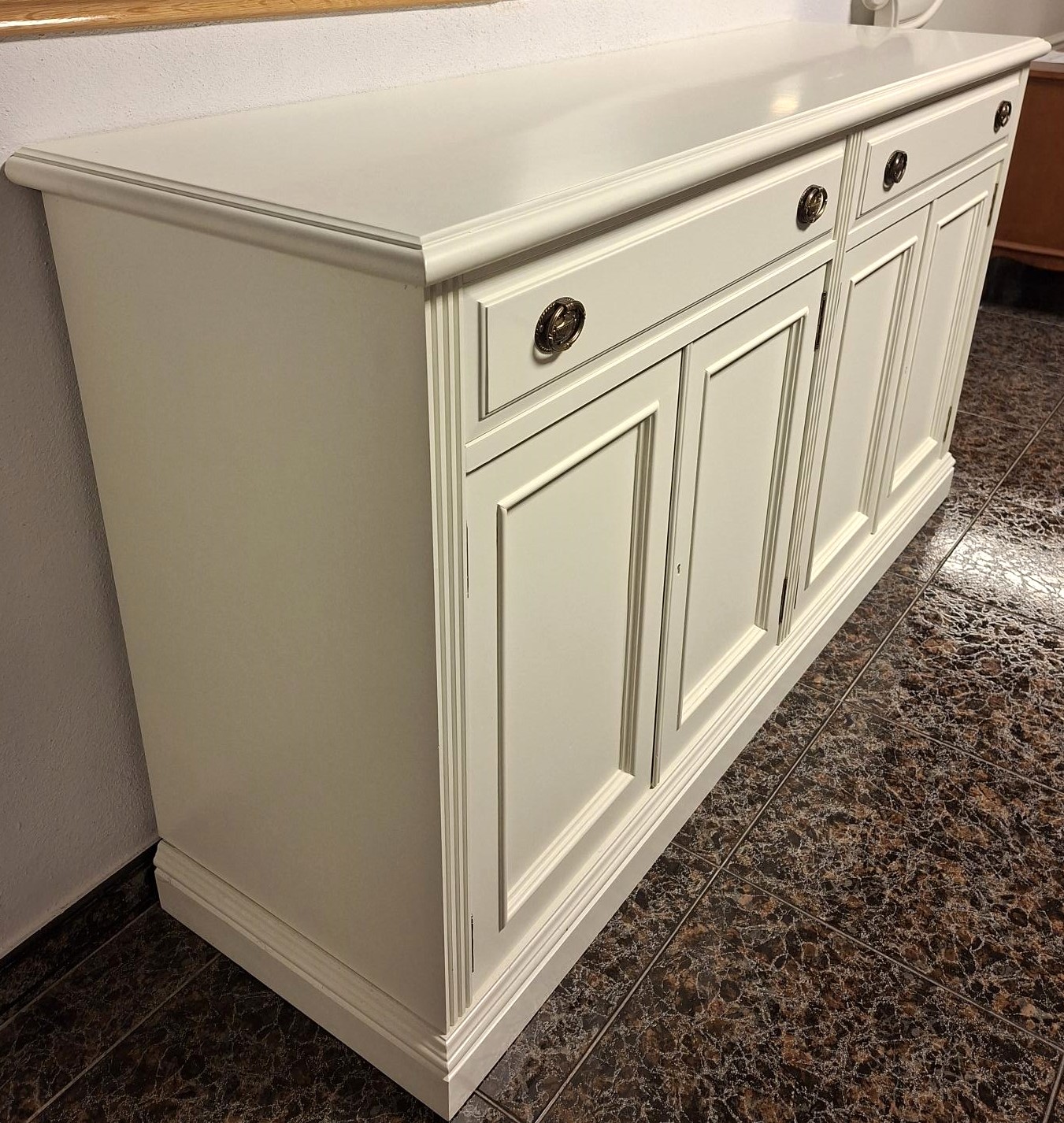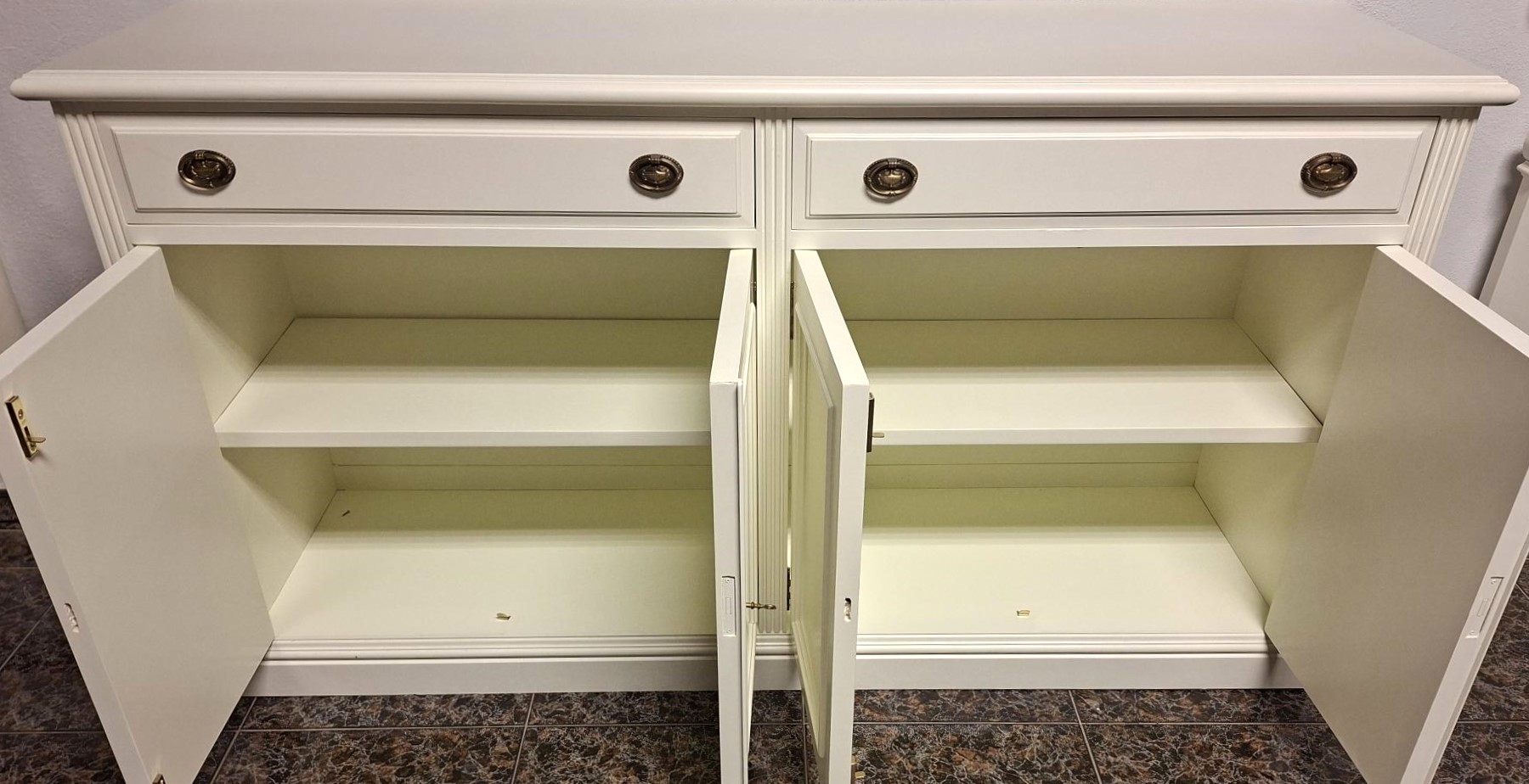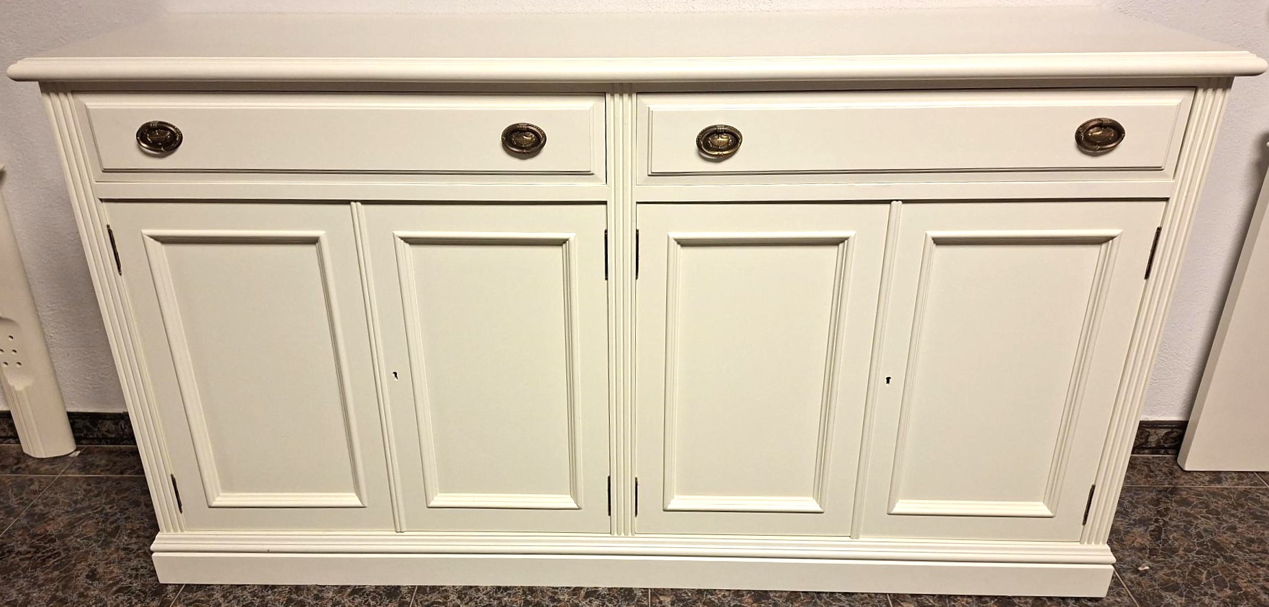 APARADOR LACADO MARFIL, CON 4 PUERTAS FONDEADAS Y 2 CAJONES MOLDADOS, BALDAS EN EL INTERIOR, MEDIDAS 163 X 47 X 90