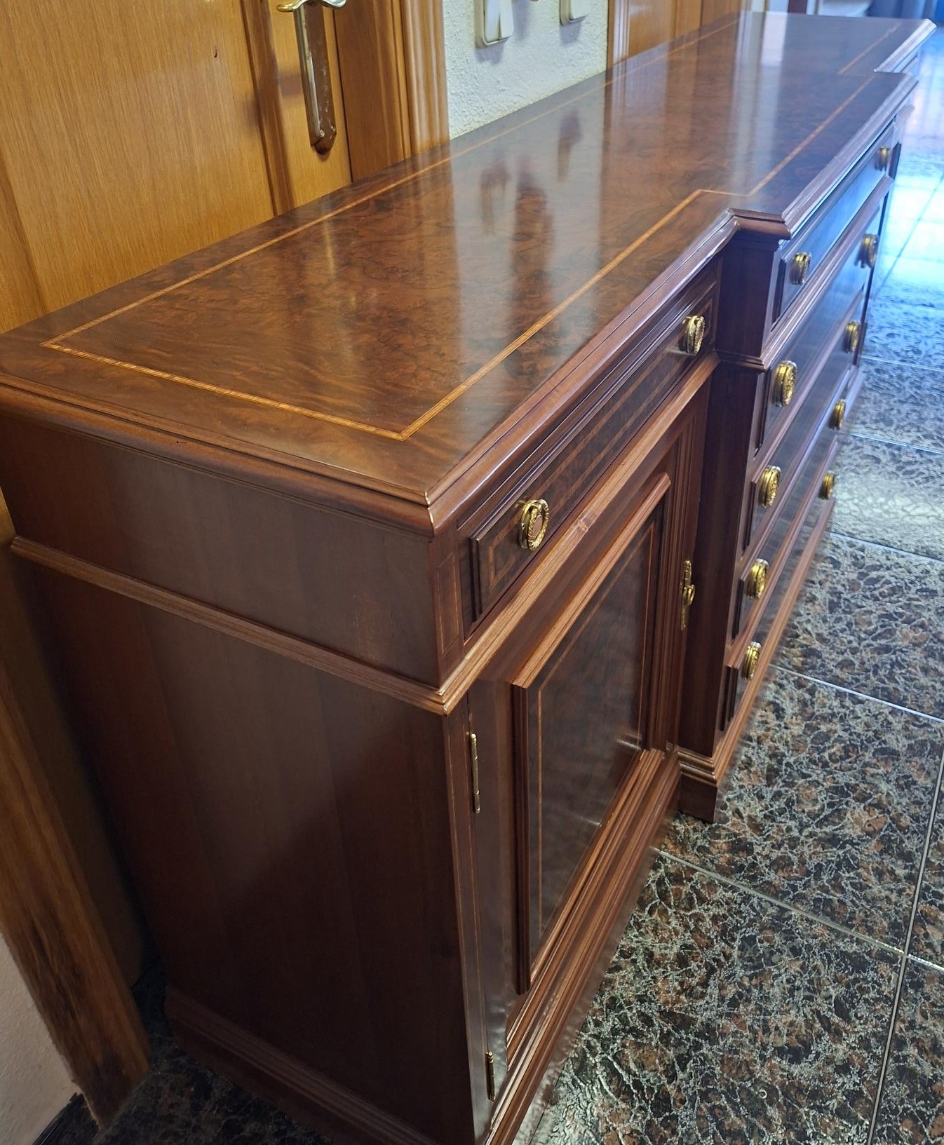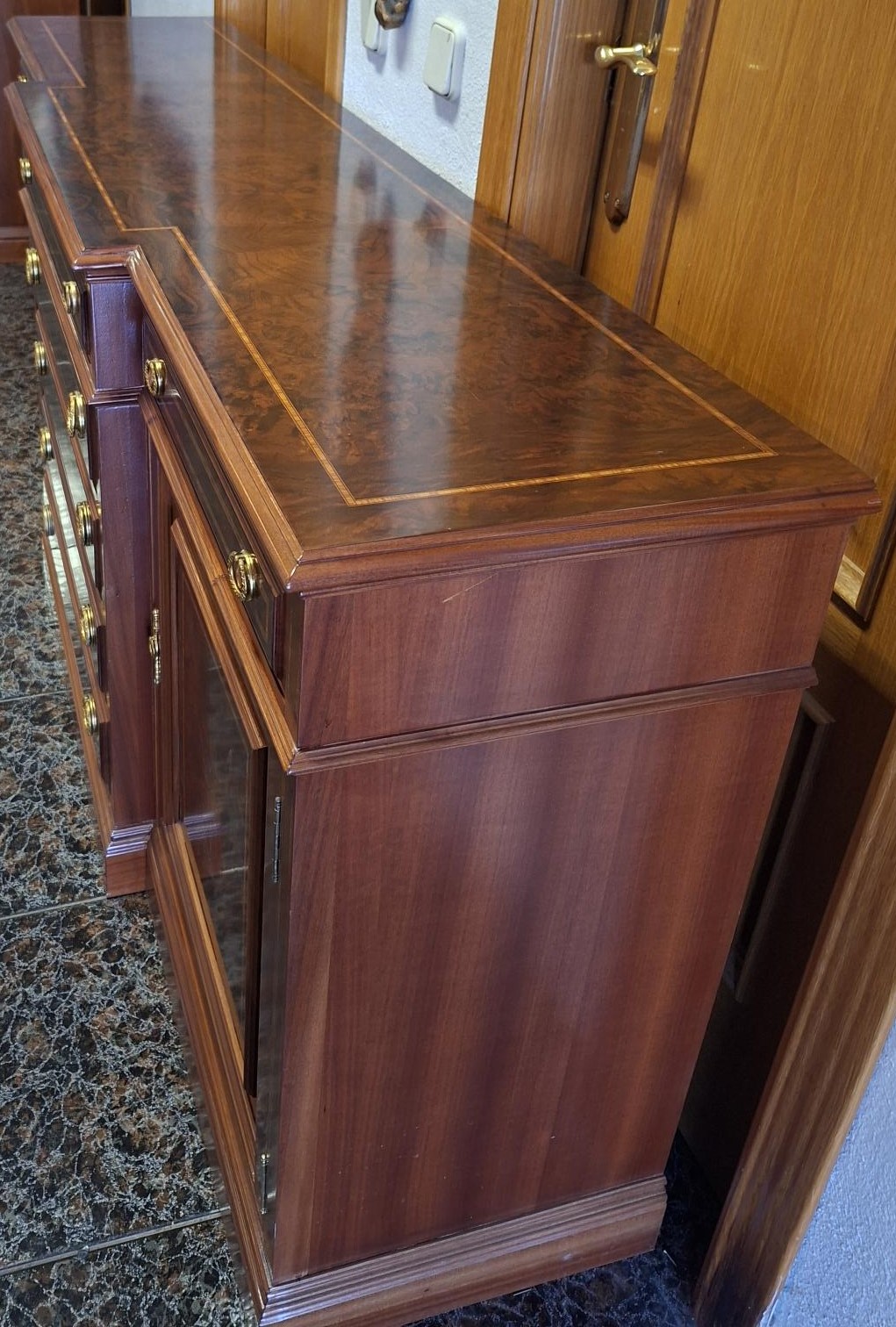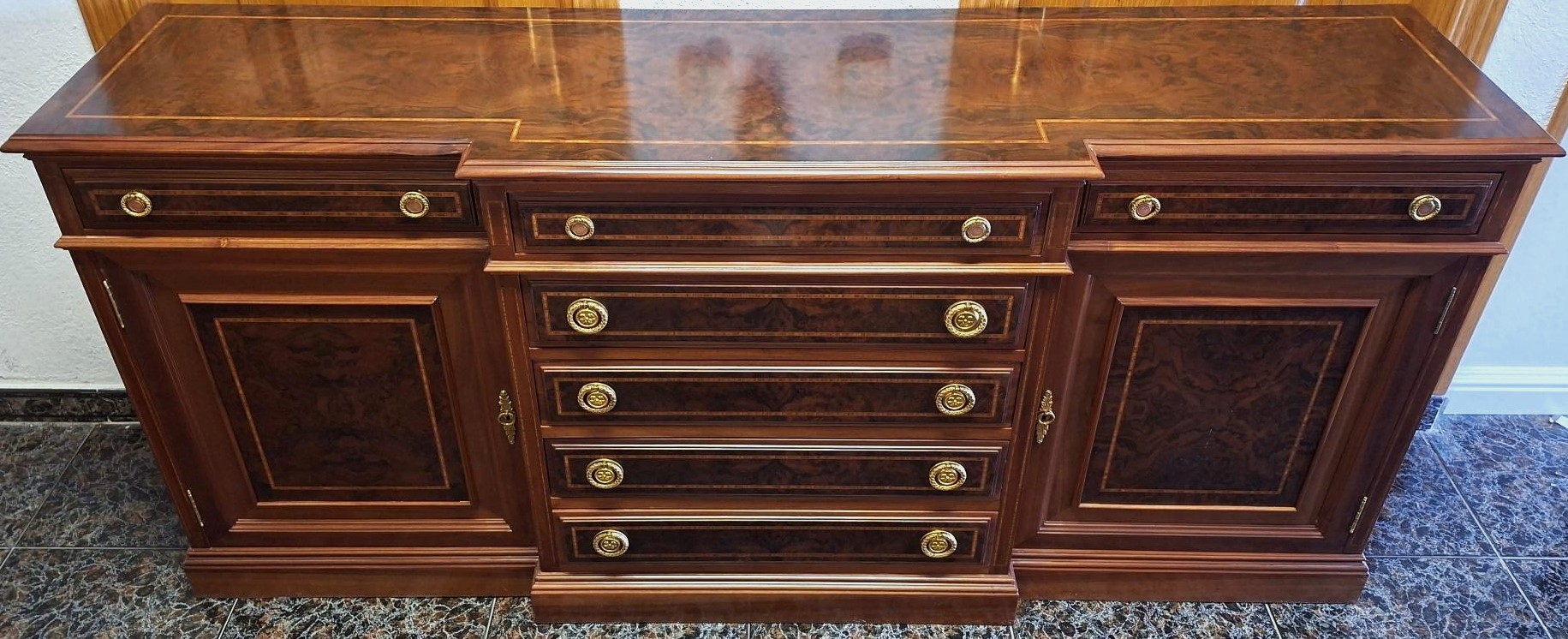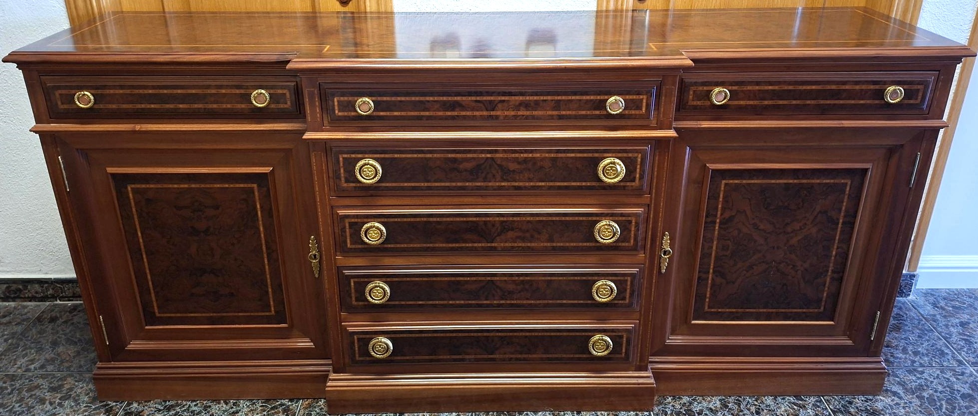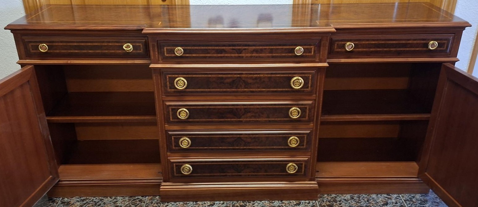 APARADOR DE RAIZ DE NOGAL CON MARQUETERIA CON 7 CAJONES Y 2 PUERTAS FONDEADAS Y PLAFONADAS INTERIOR CON BALDAS, MEDIDAS 184 X 44 X 84